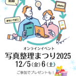 今年も12月5日の「アルバムの日」に合わせて、 オンラインで「2025写真整理まつり」を開催します。 写真整理アドバイザーによるセミナーのほか、協賛企業様によるセミナーも。 写真整理アドバイザーによる ...