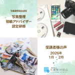 ~受講者様の声~ 写真整理アドバイザー初級研修 2025年11月・12月 今回は2025年11~12月に実施された初級研修、5件のご報告です。 実施レポートでは写真整理の専門家《写真整理アドバイザー》 ...